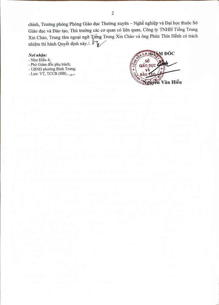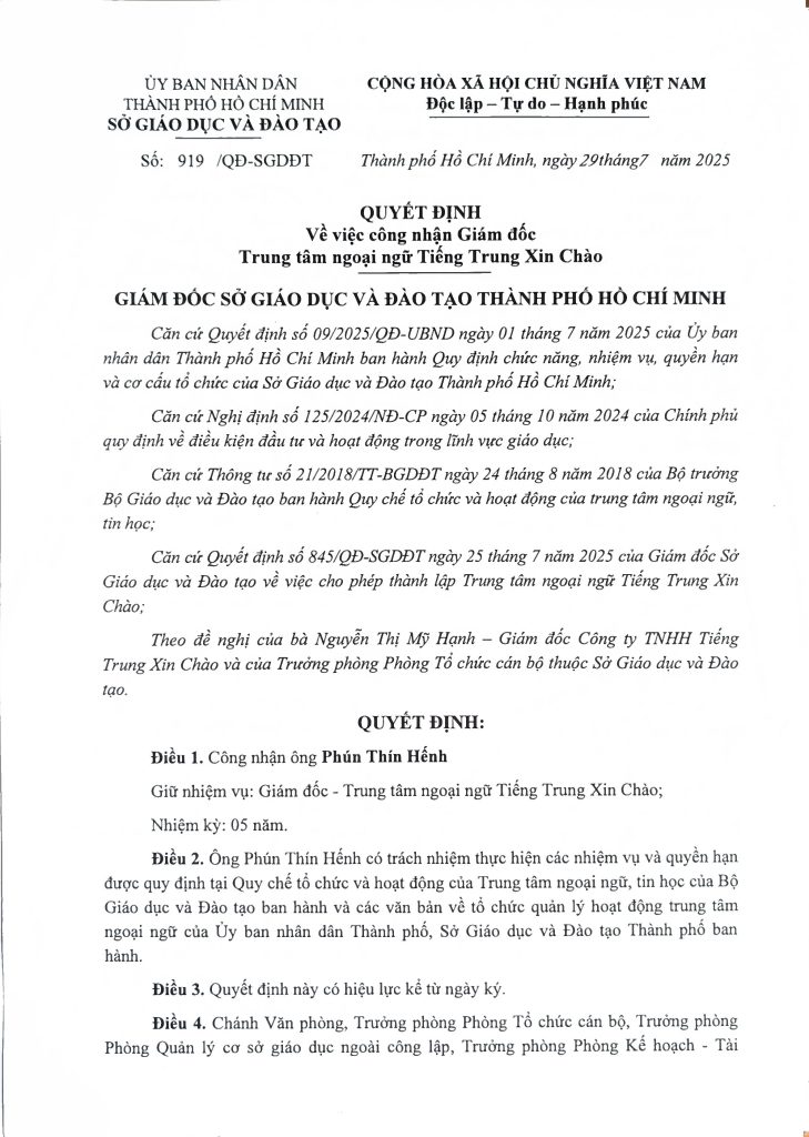 Quyết định về việc công nhận Giám đốc Trung tâm ngoại ngữ Tiếng Trung Xin Chào